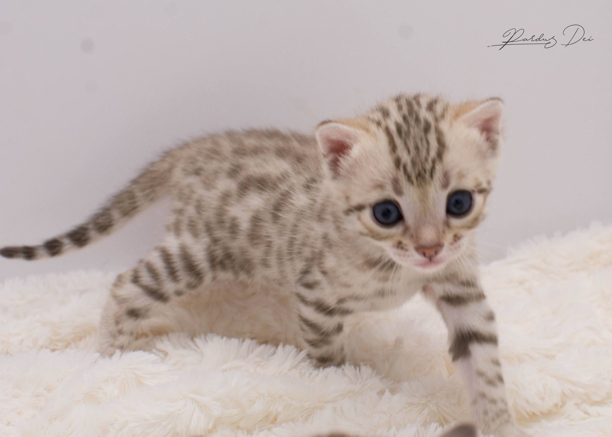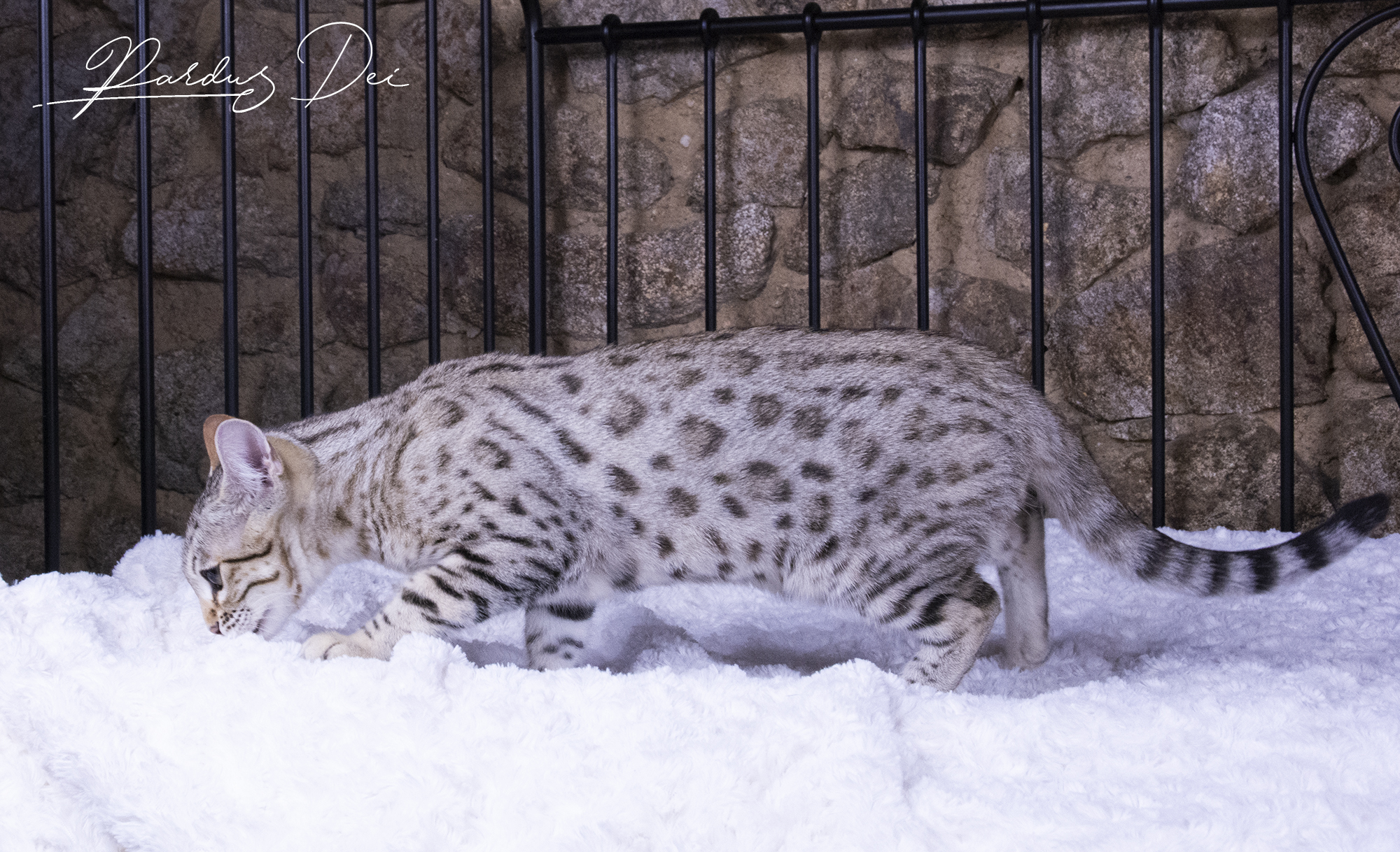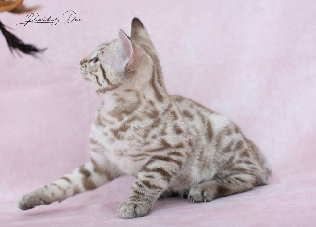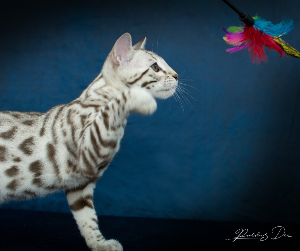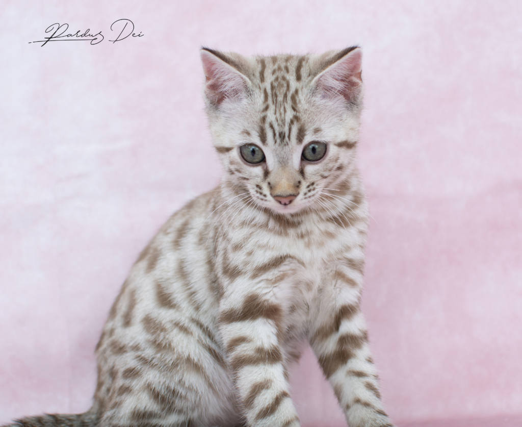 Pardus Dei Xquisite Wild Design – Femelle Bengal Silver Snow Sepia spotted – Vendu aux USA à la chatterie Miranda’s Ranch