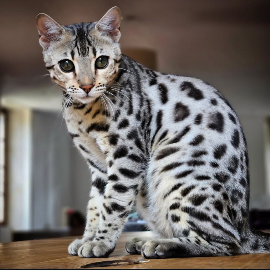 Pardus Dei Amour au Clair de Lune – Femelle Bengal silver rosetted – Vendu au Royaume Uni à la chatterie Komainu